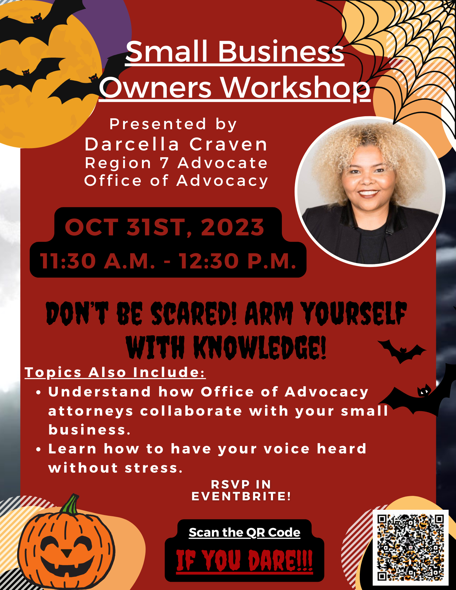 Back by popular demand, Darcella Craven will be hosting a Small Business Owners Workshop this Tuesday, October 31st at 11:30am. Darcella brings a wealth of knowledge from her experience at the Small Business Administration’s Office of Advocacy, and the resources she will provide can be put to use right away. Join us by registering for this free online event here.